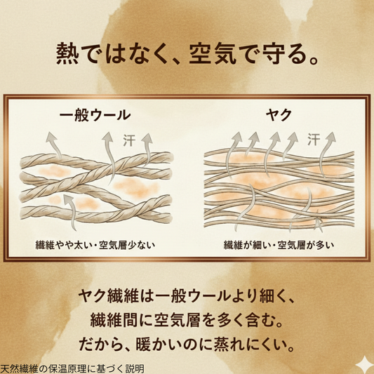 ヤクは吸湿性・放湿性に優れ、汗を外へ逃がしながら繊維内に空気層をつくります。水分で体温を奪われにくく、長時間履いても足元が冷えにくいのが特長です。